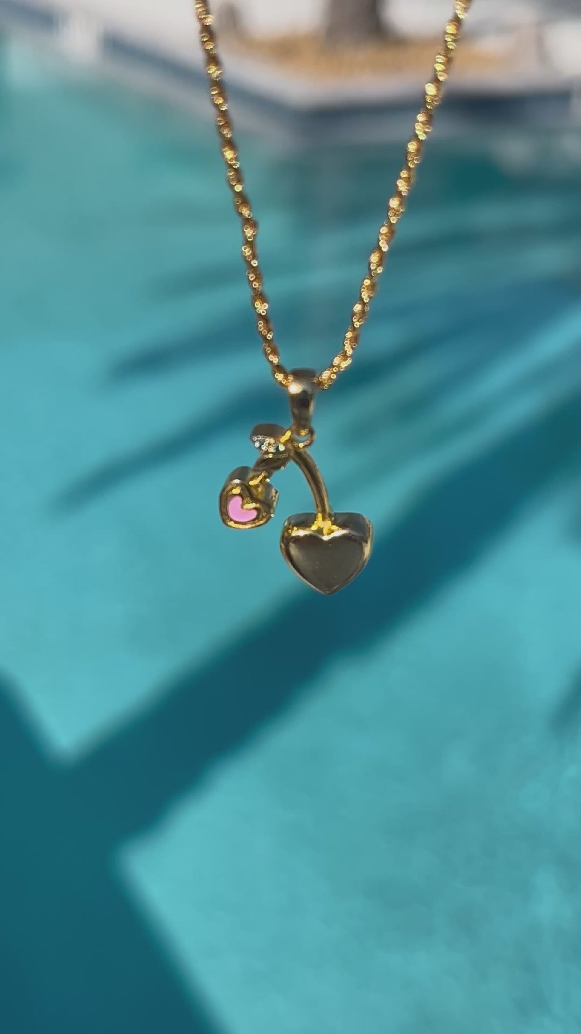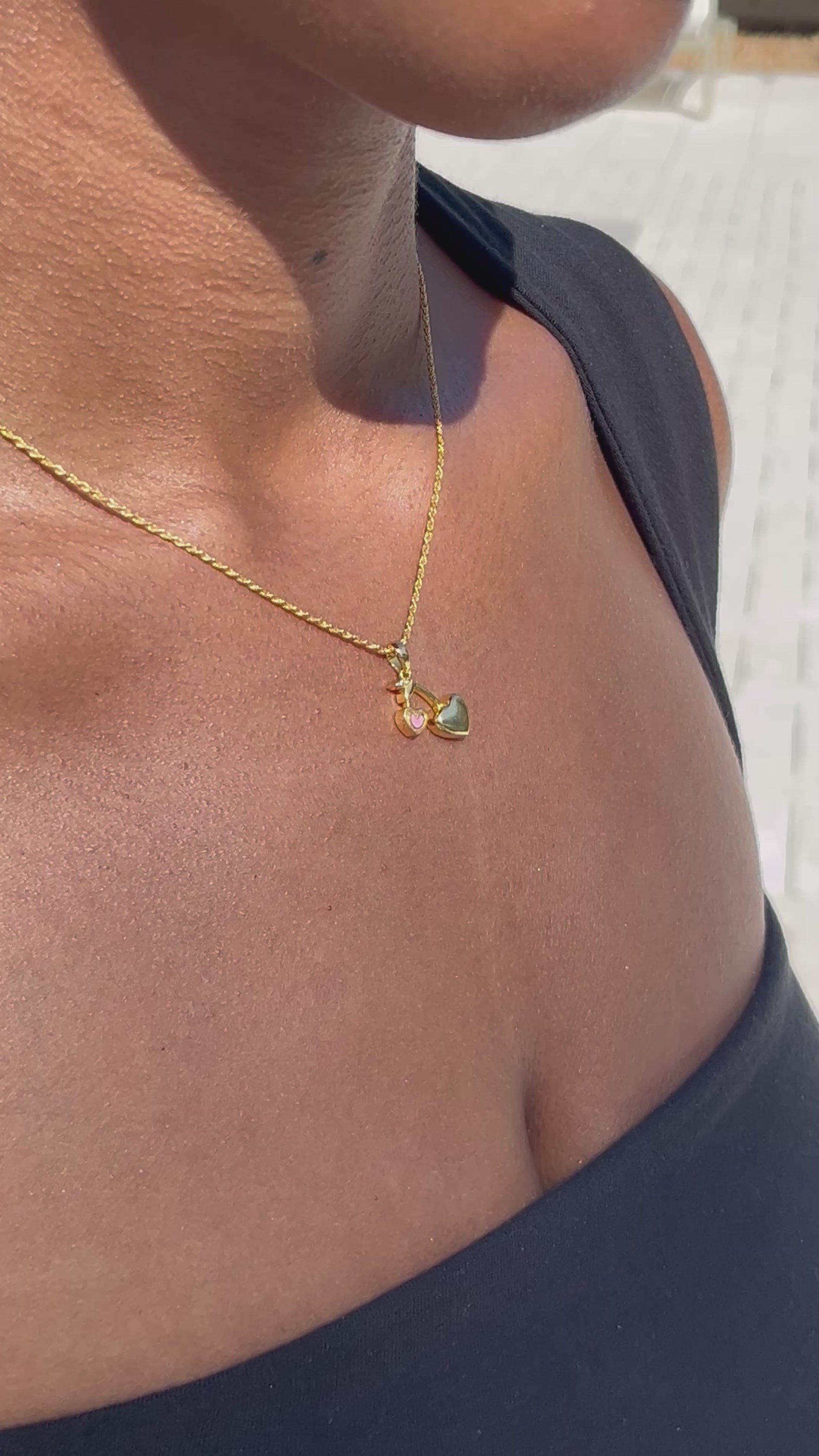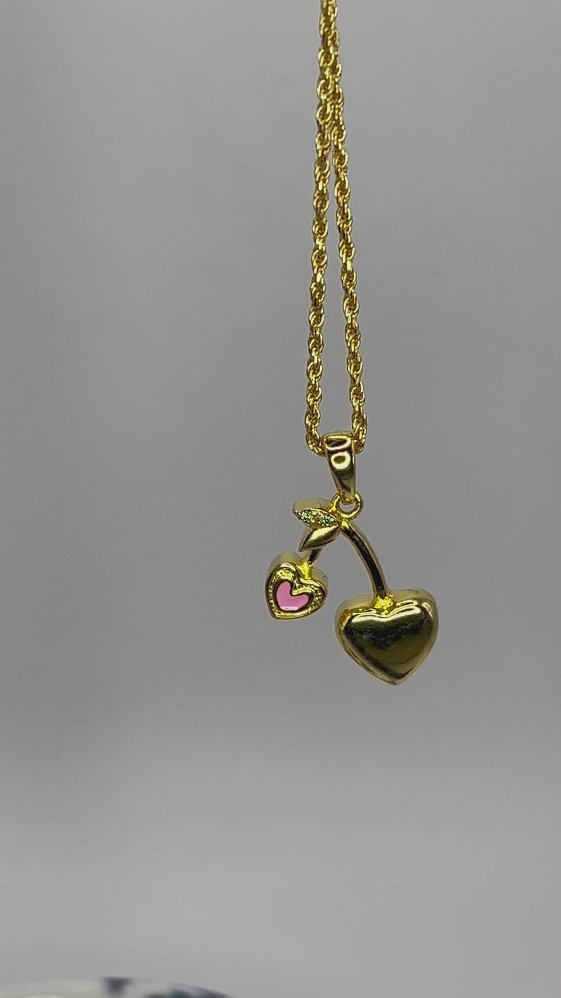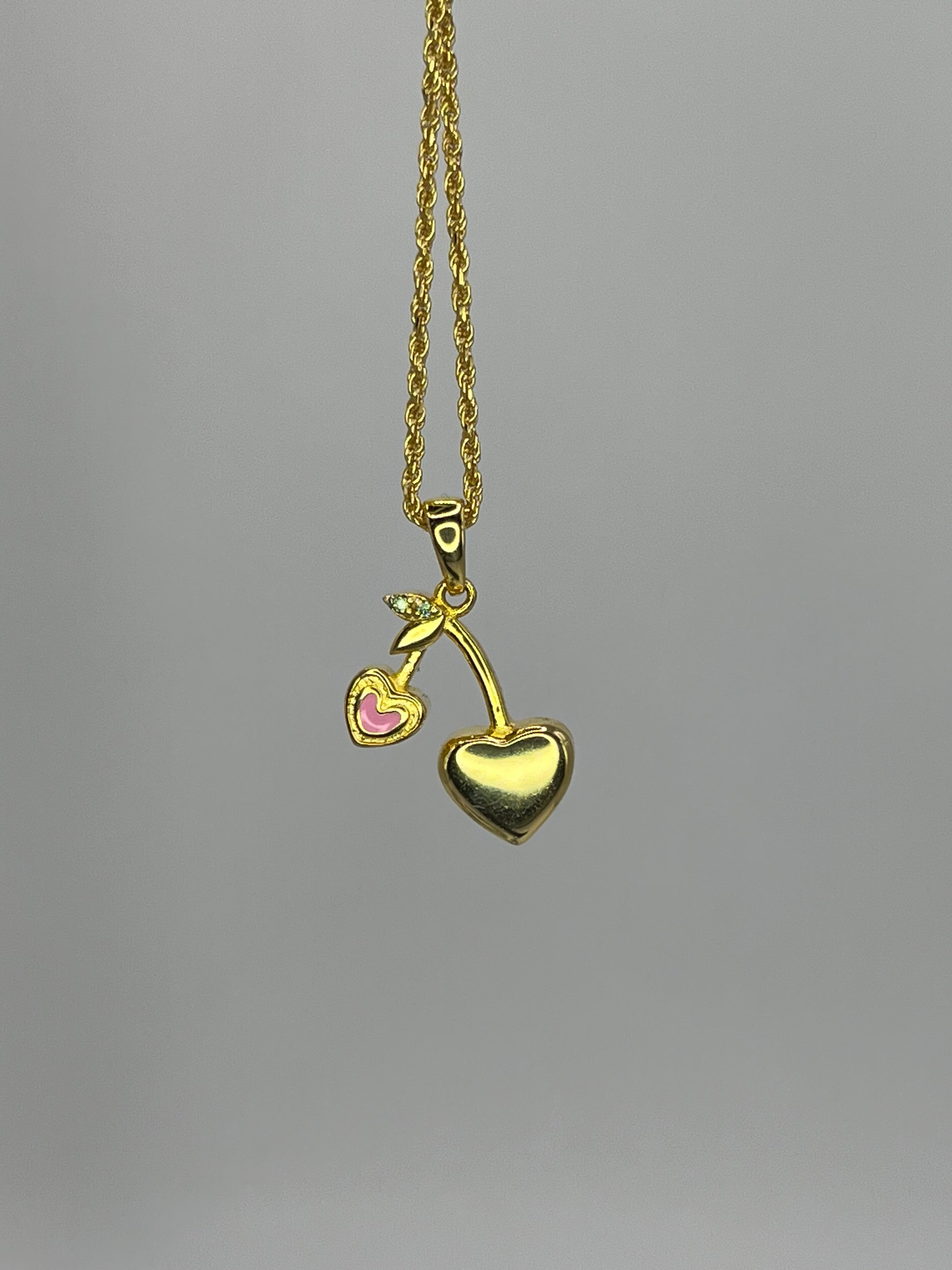 The perfect dainty necklace for the summer! Cherry hearts with a subtle pop of pink. Green moissanite diamonds adorn the leaves at the top.